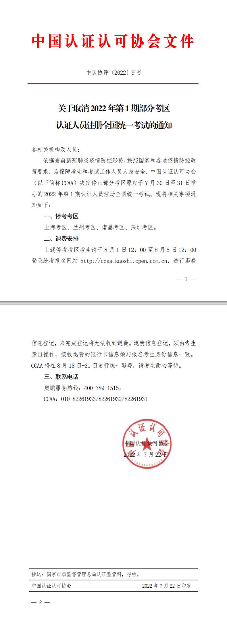 中国认证认可协会近日发布《关于取消2022年第1期部分考区认证人员注册全国统一考试的通知》,决定停止上海考区、兰州考区、南昌考区、深圳考区原定于7月30日至31日举办的2022年第1期认证人员注册全国统一考试。相关通知如下: