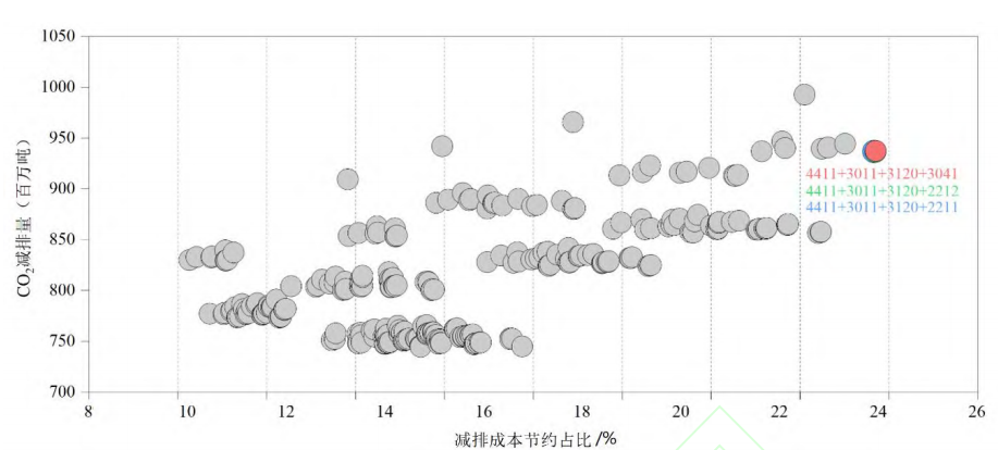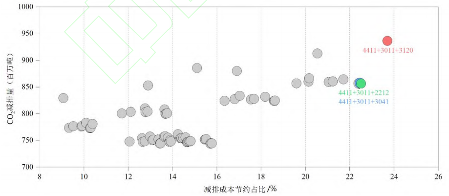 上图展示了全国碳市场一次性纳入1~3个计划内行业的全部行业组合模拟结果,减排成本节约占比最高的行业组合即为最优纳入组合顺序。