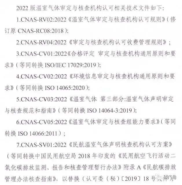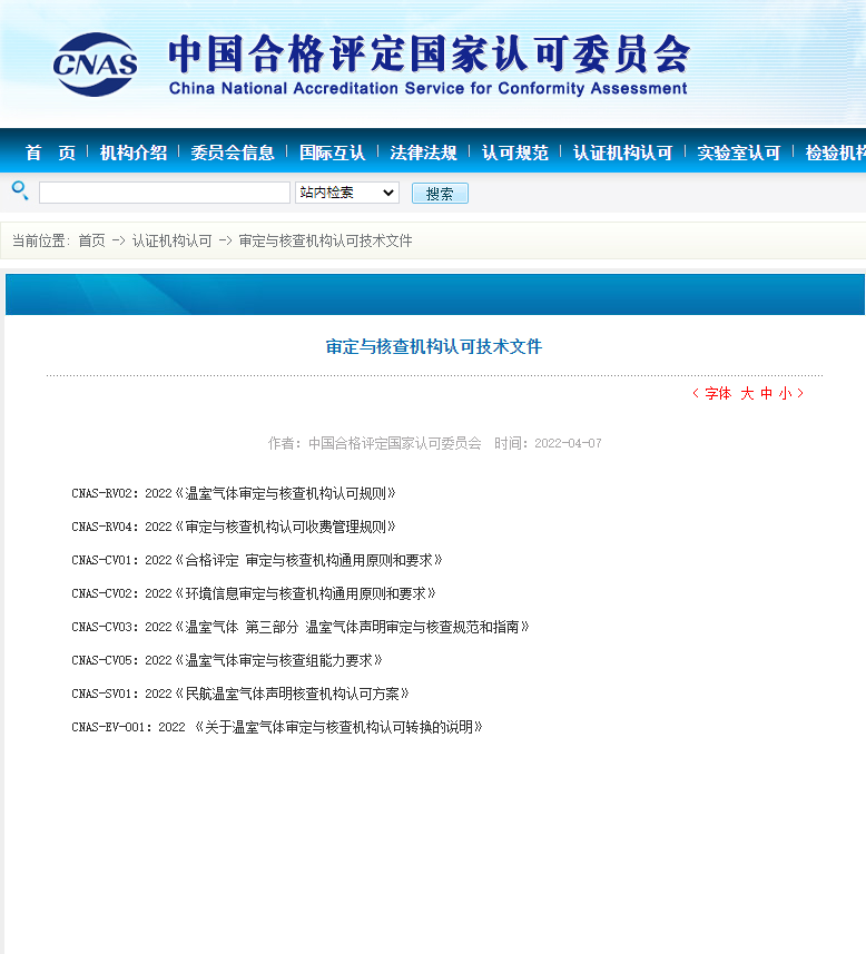 国际标准化组织(ISO)相继于2019年、2020年发布了ISO/IEC 17029:2019《合格评定 审定与核查机构通用原则和要求》、ISO 14064-3:2019《温室气体 第三部分:温室气体声明审定与核查规范和指南》和ISO14065:2020《环境信息审定与核查机构通用原则和要求》。根据国际审定与核查标准的更新变化情况,中国合格评定国家认可委员会(CNAS)组织对原2018版温室气体审定与核查机构认可规范文件(CNAS-RC08:2018、CNAS-CC04:2018、CNAS-CC41:2018)进行了集中换版,研究制修订了2022版温室气体审定与核查机构认可规范文件。同时,为贯彻国际认可论坛(IAF)2019年发布的相关标准转换决议,CNAS制订了温室气体审定与核查机构认可转换说明文件。
