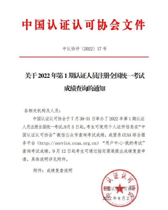 近日,中国认证认可协会(CCAA)发布2022年第1期认证人员注册全国统一考试成绩查询的通知,今天(9月5日)起考生可查询考试成绩。
